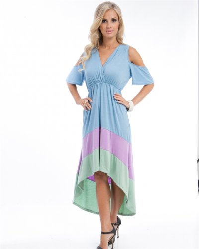 - V-Neckline, short sleeves with cut out details on shoulder, empire waist, flared circle high low bottom finished off with a color blocked hem